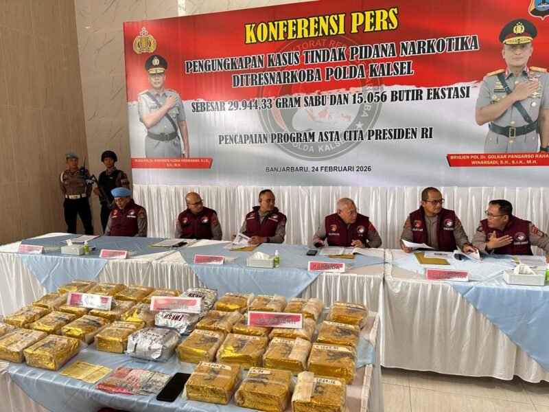 pro1.id,BANJARBARU – Direktorat Reserse Narkoba (Ditresnarkoba) Polda Kalimantan Selatan mengungkap kasus besar peredaran gelap narkotika dengan menyita 29,9 kilogram sabu dan 15.056 butir pil ekstasi. Pengungkapan tersebut disampaikan dalam konferensi pers, Selasa (24/2/2026) siang.
