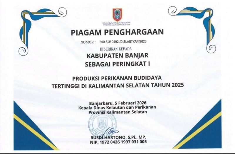 pro1.id, MARTAPURA – Kabupaten Banjar kembali mencatatkan capaian positif di sektor perikanan. Pada tahun 2025, daerah ini berhasil meraih peringkat pertama sebagai penghasil produksi perikanan budidaya tertinggi di Kalimantan Selatan.